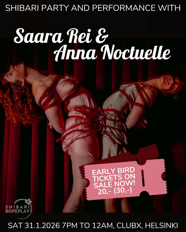 Bileet / Shibari Ropeplay Party & Performance: Saara Rei & Anna Noctuelle 31.1 @ ClubX« Uusin viesti kirjoittanut shibariropeplay tänään kello 12:29 »![]() Saara Rei ja Anna Noctuelle esiintyvät ClubX:llä. Esitys on saanut inspiraationsa Marina Abramovićin Rhythm 0 esityksestä. Mukana sidontaa, lempeitä sekä kivuliaita välineitä. Mitä sinä tekisit? Early bird liput myynnissä nyt: https://clubx.eventiolive.fi/events/69525a925f5346fb1a8b4567/ 6